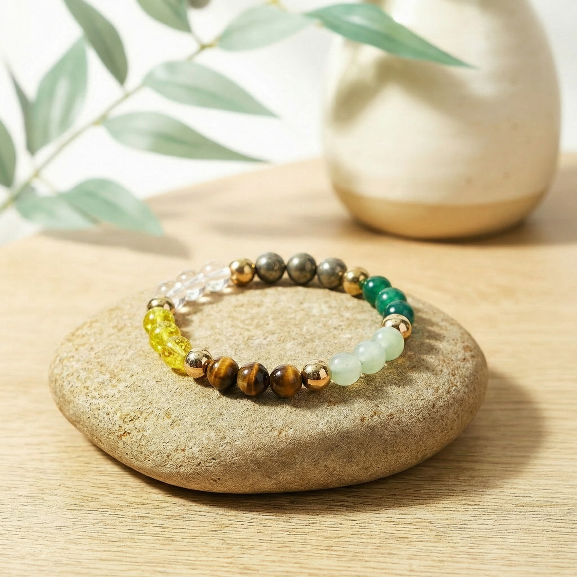 Made with natural crystals: Tiger Eye, Pyrite, Citrine, Quartz, Green Aventurine & Hematite. Slight color variations are natural and indicate authenticity.